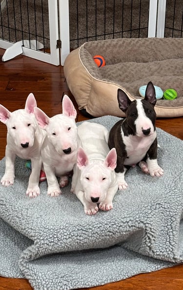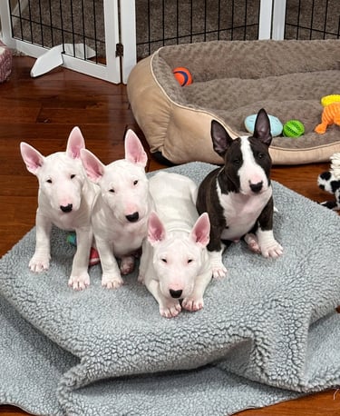 Highland Bullies began with a simple passion: to raise well-adjusted, healthy, and social Bull Terriers. With years of experience, we’ve built a breeding program that focuses on temperament, health, and quality rather than quantity. Each of our dogs is a cherished member of our family, and every puppy is raised underfoot in a loving home, surrounded by care and attention from day one.